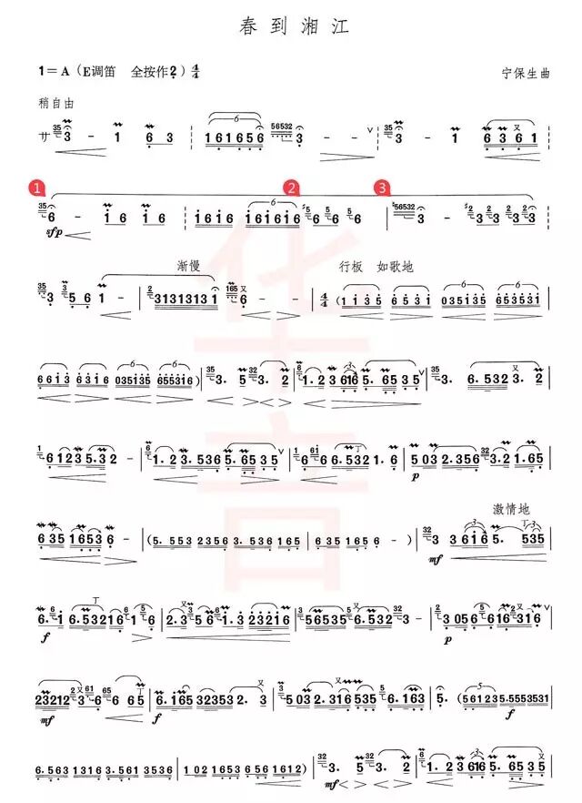 行板:想象自己身处湘江之中,欣赏两岸的风景,把情感投入到吹奏中;注意三度的加花,回来加上二度的小加花;