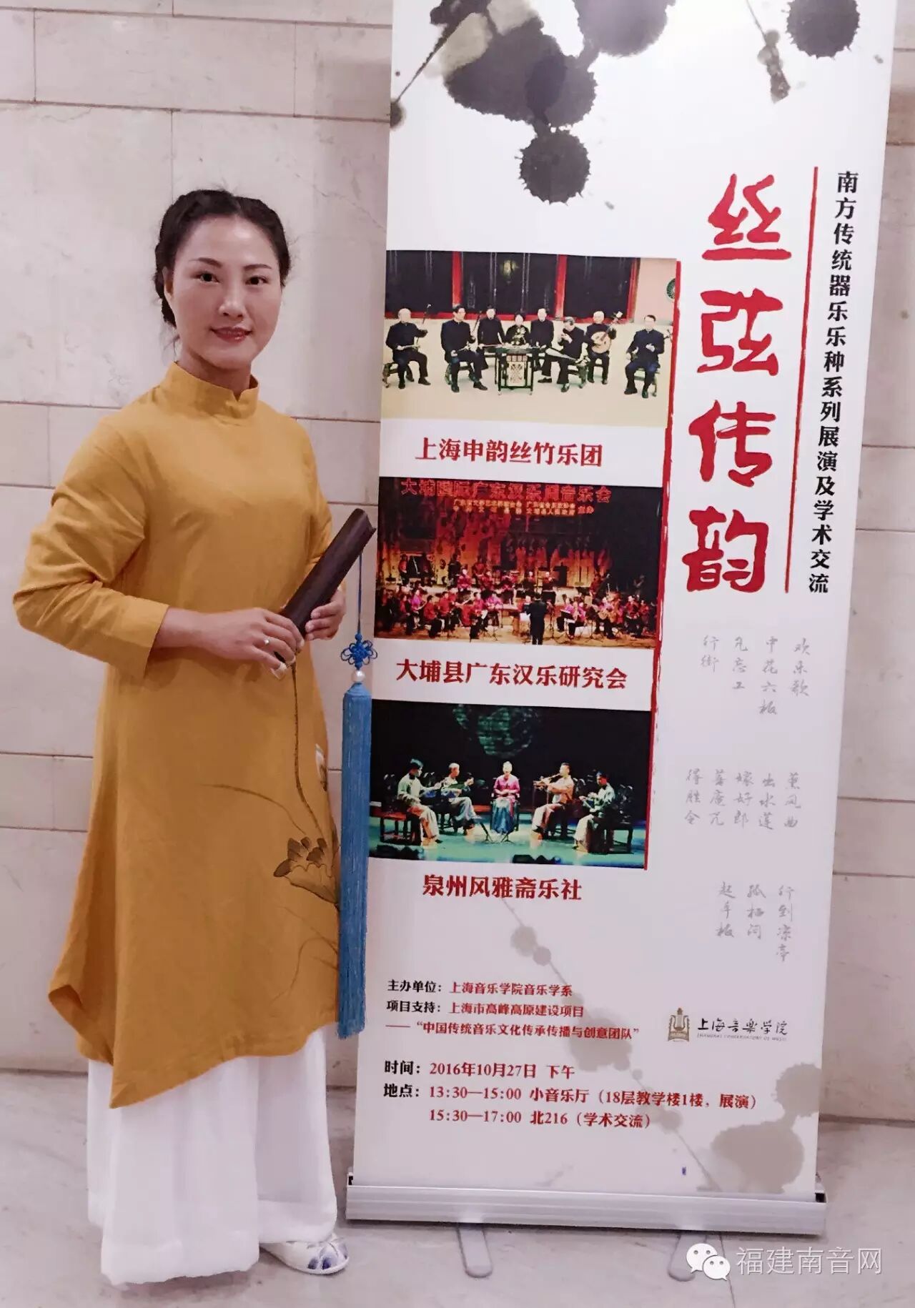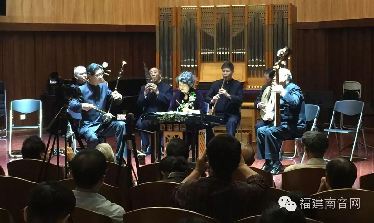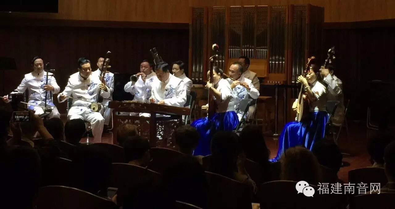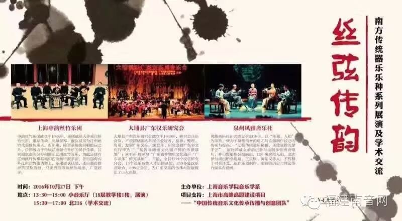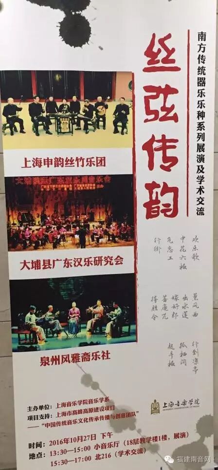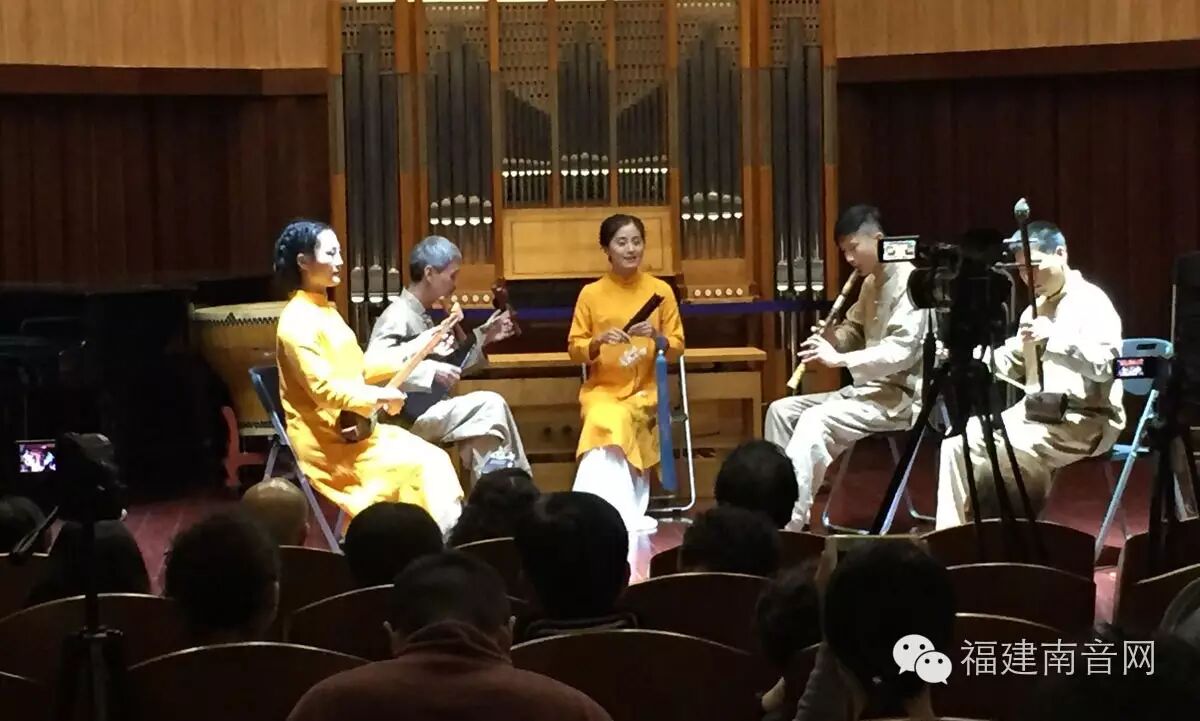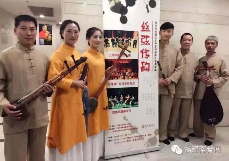 10月27日,泉州风雅斋乐社六位南音高手受邀进高等音乐学府——上海音乐学院,参加“《丝弦传韵》南方传统器乐乐种系列展演及学术交流”,展演了南音四大“管门”音乐的指、曲、谱“三部曲”,曲目包括《行到凉亭》、《孤栖闷》、《风打梨》、《起手板》。乐师们高超、娴熟的技艺和演唱,赢得了在场专家、学者及师生的一致好评,南音大受热捧,南音乐器引起大家极大的兴趣。