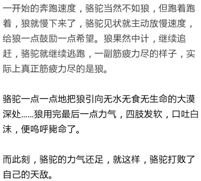 在这一点上,骆驼肯定不是狼的对手。不过,骆驼却有另一手——它的生存手段不是进攻,而是逃跑。