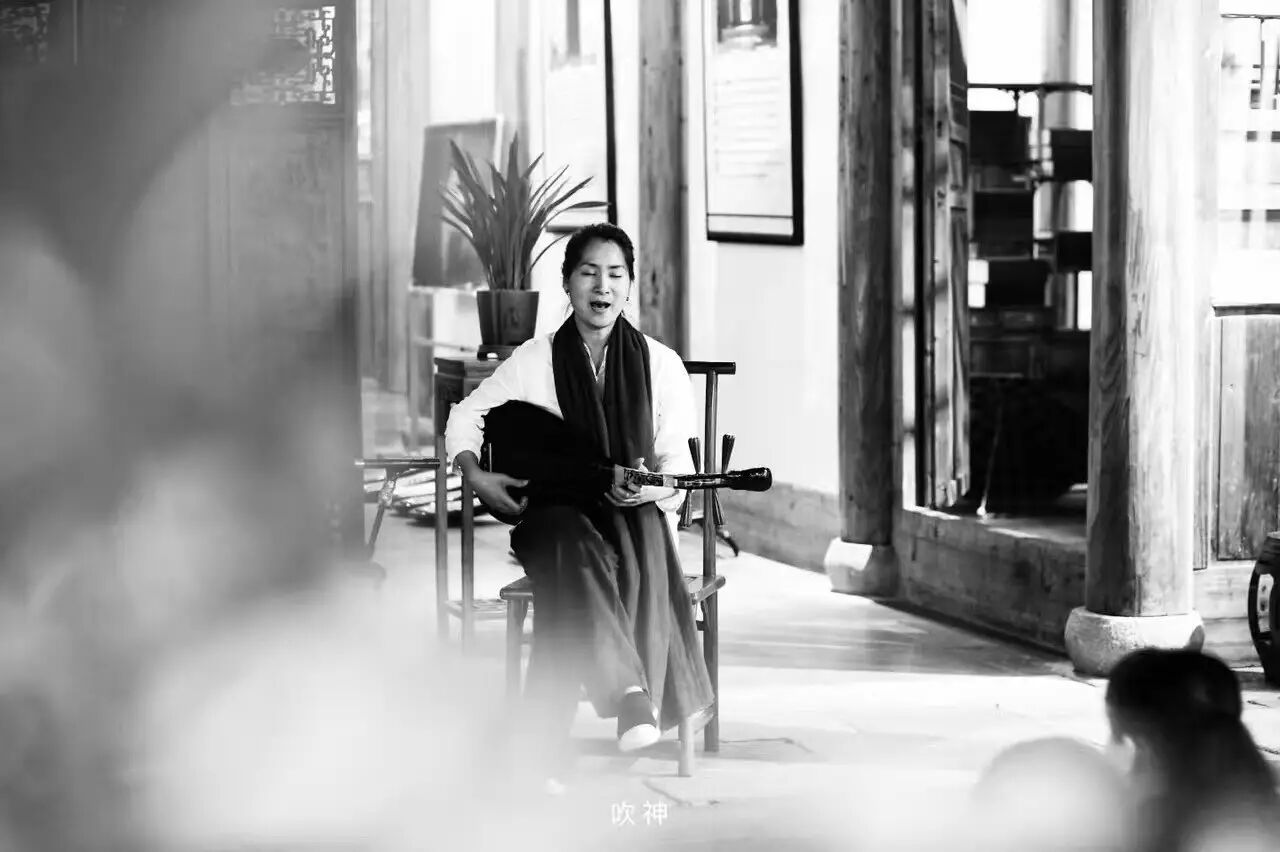 一身素衣,一双白袜,用古老的静态“坐唱”或“站唱”为主的形式,力求朴素,回到南音最初的状态。无关表演,只有“音”,只有自己。