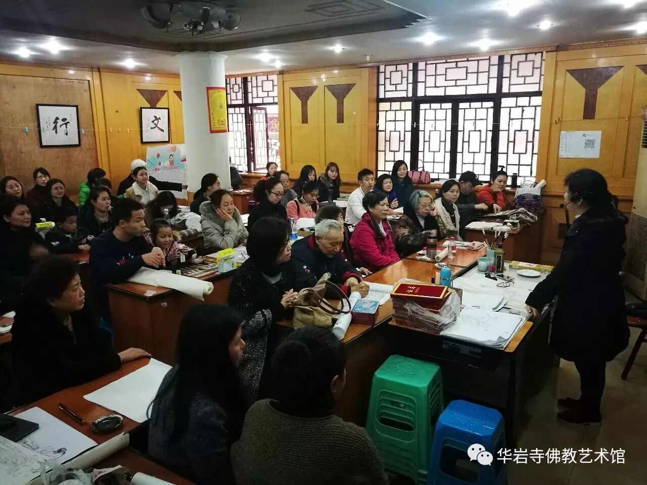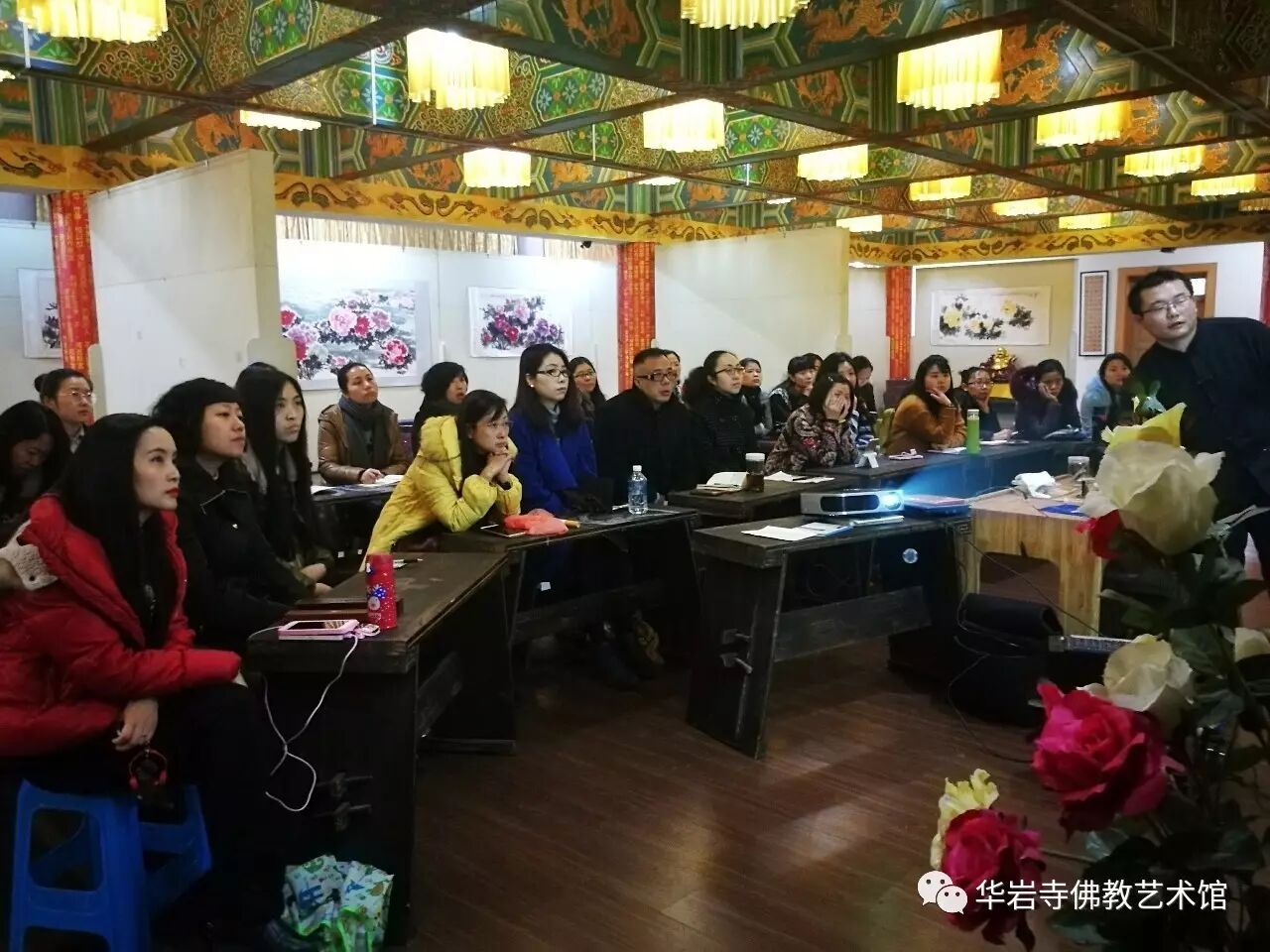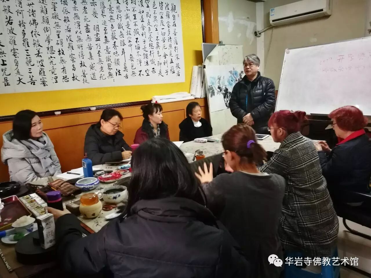 工笔画是以精谨细腻的笔法描绘景物的中国画表现方式。周日下午在华岩寺弘法楼二楼第三期工笔画公益班正式开课,近六十名学员参加本次学习。张馆长代表寺院为大家作开班致辞。本期课程继续由国家一级美术师侯洪俊老师授课。 侯老师介绍了工笔画的分类与基本步骤,画具的试用方法。并为上一期给华岩寺捐画的学员颁发收藏证书。课后老师和新老班委成员开会,落实了具体分工,志在为这一期的公益班义务服务,让大家在一个融暖的环境下共同学习,更好地传承中国传统国画画法。