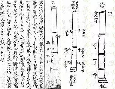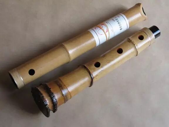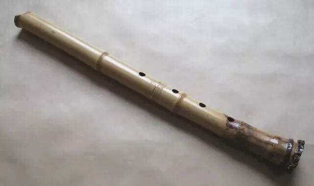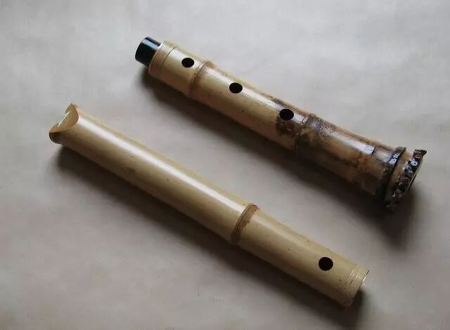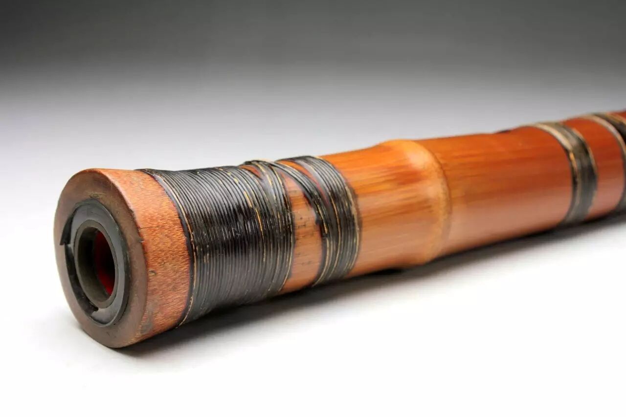 一、古代尺八 又名地无管。外切式吹口,五孔,前四后一,无凤眼。古代尺八一般在普化宗明暗尺八流派中继续保存,在竹材尺寸、形态要求上非常严格,依靠天然符合要求的竹材才能制作出精良的地无尺八,其音色自然、古朴、深邃。