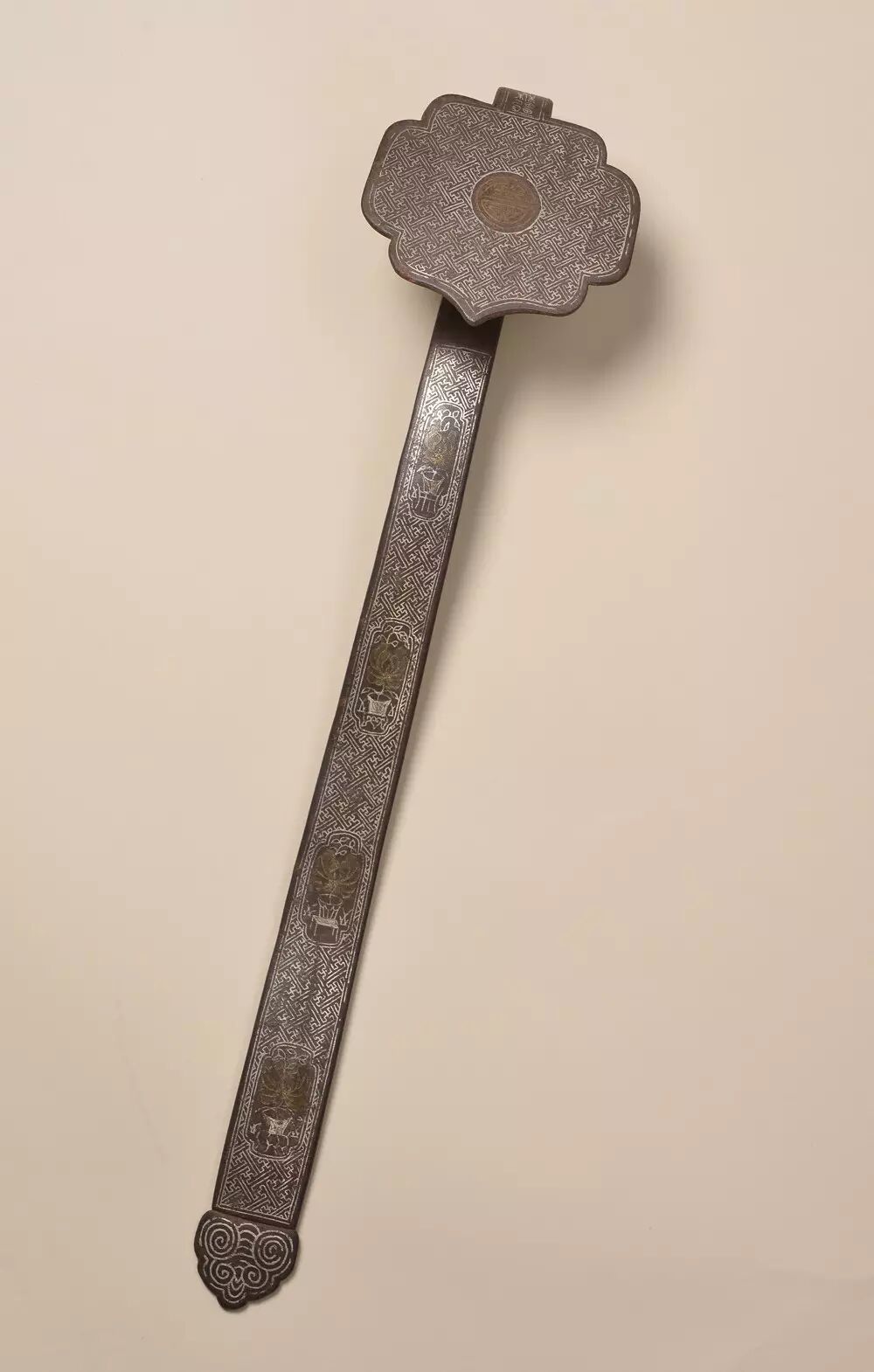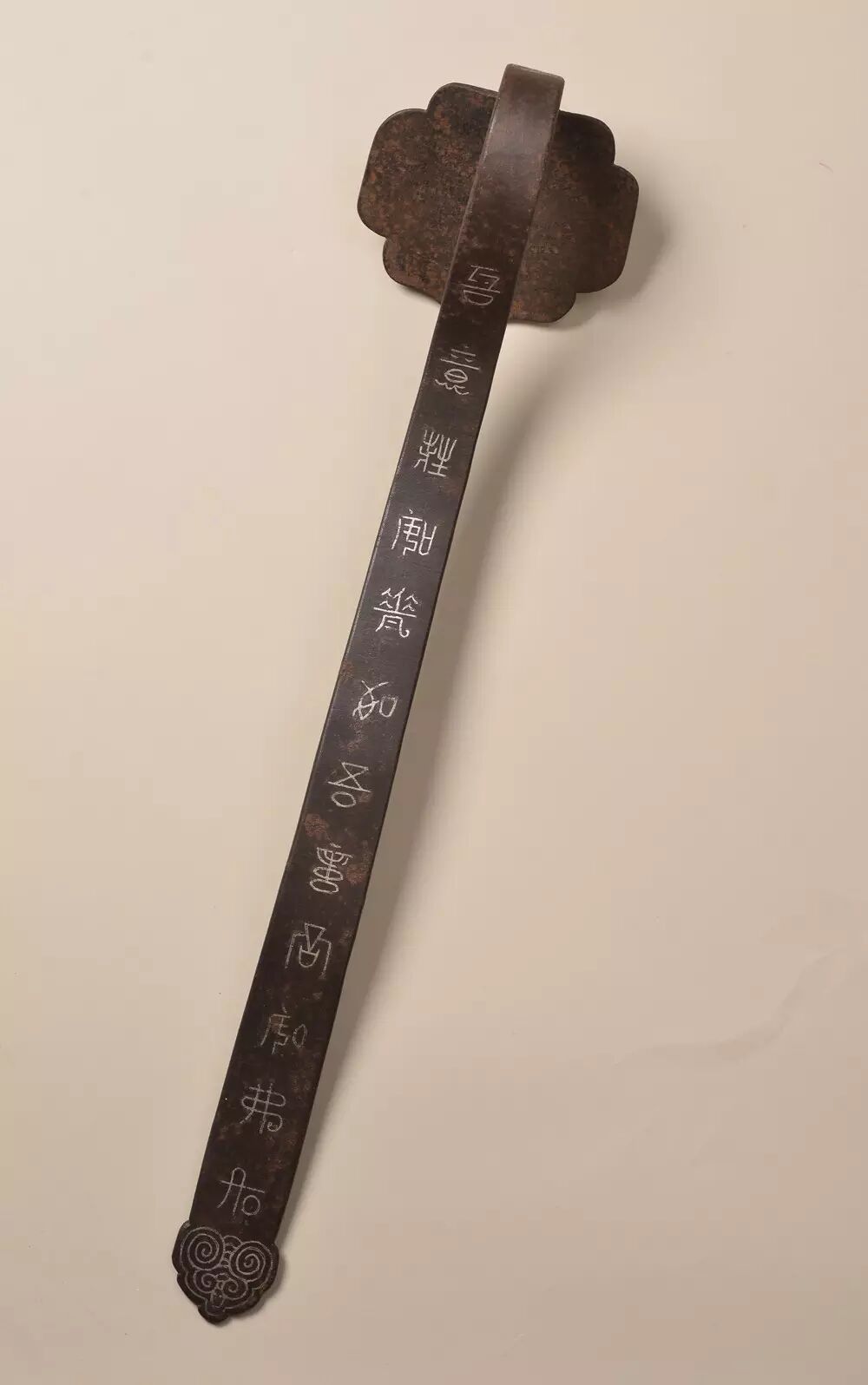此如意为铁质,嵌银丝,弓背处方框内饰“万寿无疆”,背面嵌银丝篆书释文。银丝粗细匀称,细密繁琐,精工细作。