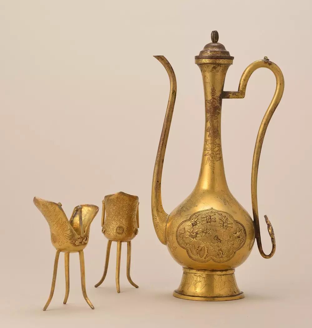 此壶铜质,鎏金,配两杯。金色自然华丽,腹部开光刻锦地花鸟,中国文人花鸟画构图,整体造型优美流畅,纹饰精细传神。小杯仿古造型,刻有“福”字,周身线刻花卉纹饰,亦做工精细。