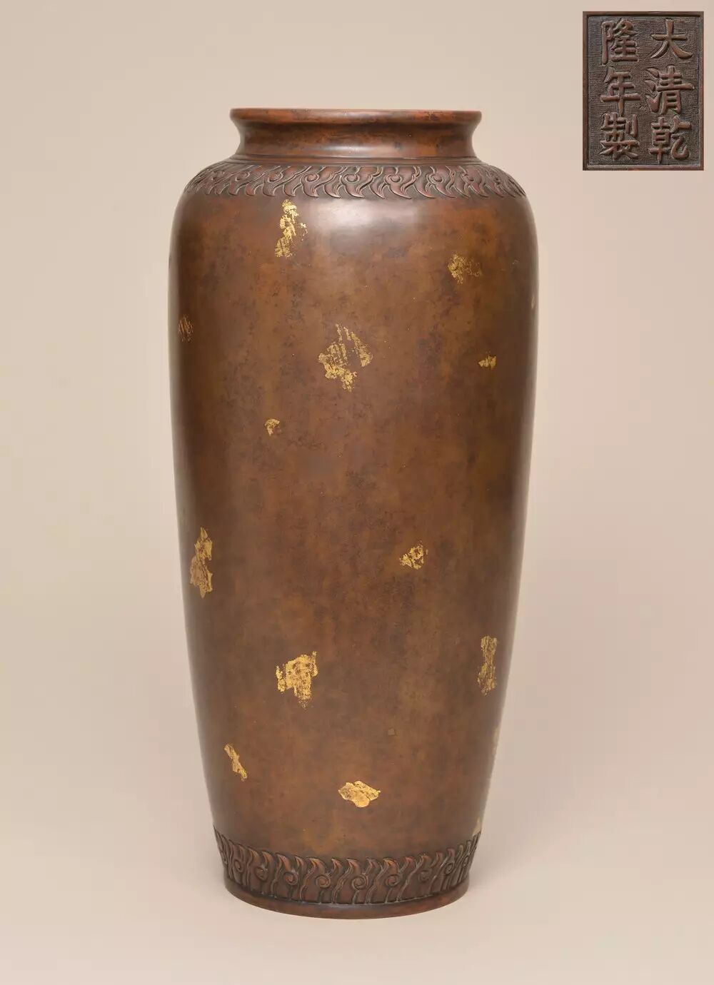 瓶铜制,洒金。唇口,束颈,平肩,弧腹,圈足。底有“大清乾隆年制”款,肩和近足处饰整齐排列的如意云纹,周身洒金点点,瓶体厚重,造型古朴大气,包浆温润,品相上佳。