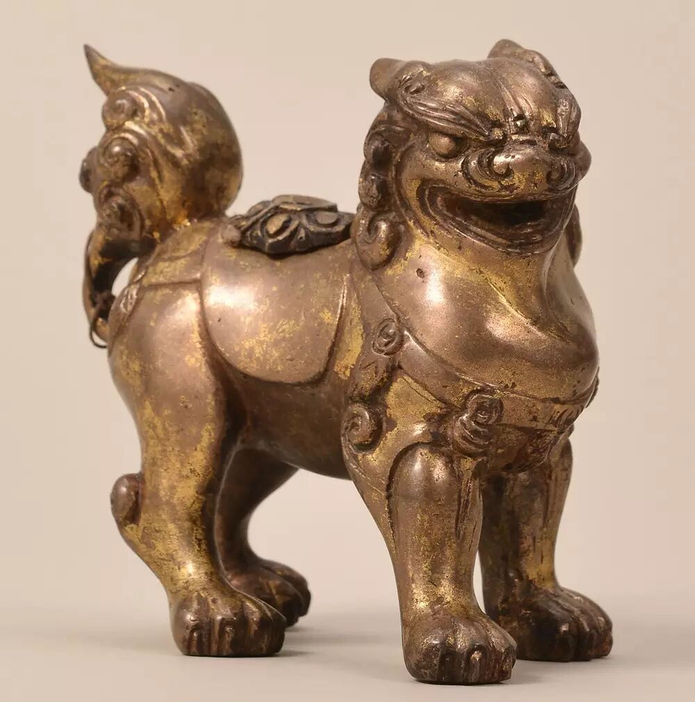 香薰铜制,通体鎏金。狮子怒眼竖眉,立耳巨口,利爪卷尾,昂首站立,威猛之余不失神采,端庄之下亦有憨厚。造型简练遒劲,筋肉须发刻划精致,细微之处亦现精到。