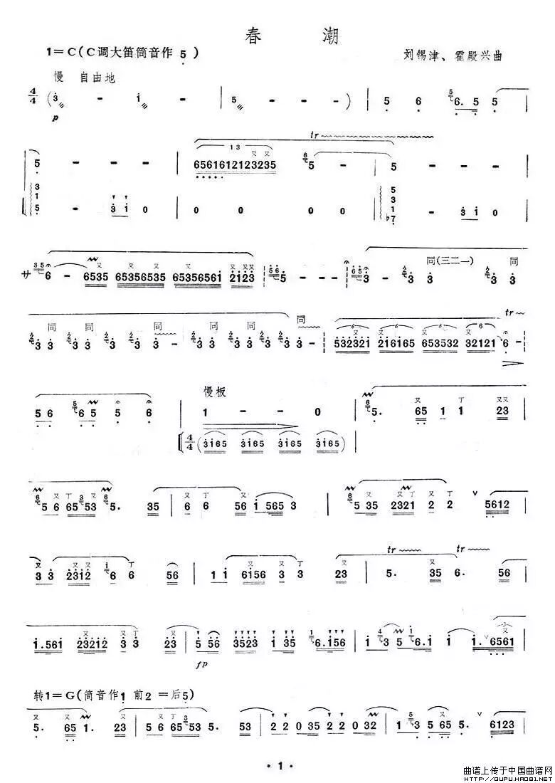 带有呼吸性音调开始的,辽阔的引子,在乐队清爽的和弦与布谷鸟啼鸣的背景下,形象的描绘出春江的晨景。慢板,优美动听的旋律,经转调和笛子水花般的音型映衬,层层深化的展现出江上的一派生机、船歌声声的画面。