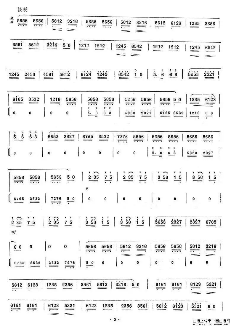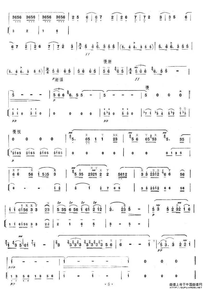 笛子再次强化春晨美景的自由板之后,乐曲进入快板。笛子连绵的波浪式律动和号子般的音调相结合在乐队的呼应下不断展开 ,勾画出船影叠叠破浪捕鱼的繁忙景象。其间插入的模仿复调,抒发着渔民的喜悦之情。最后部分是第一段慢板的减缩再现。