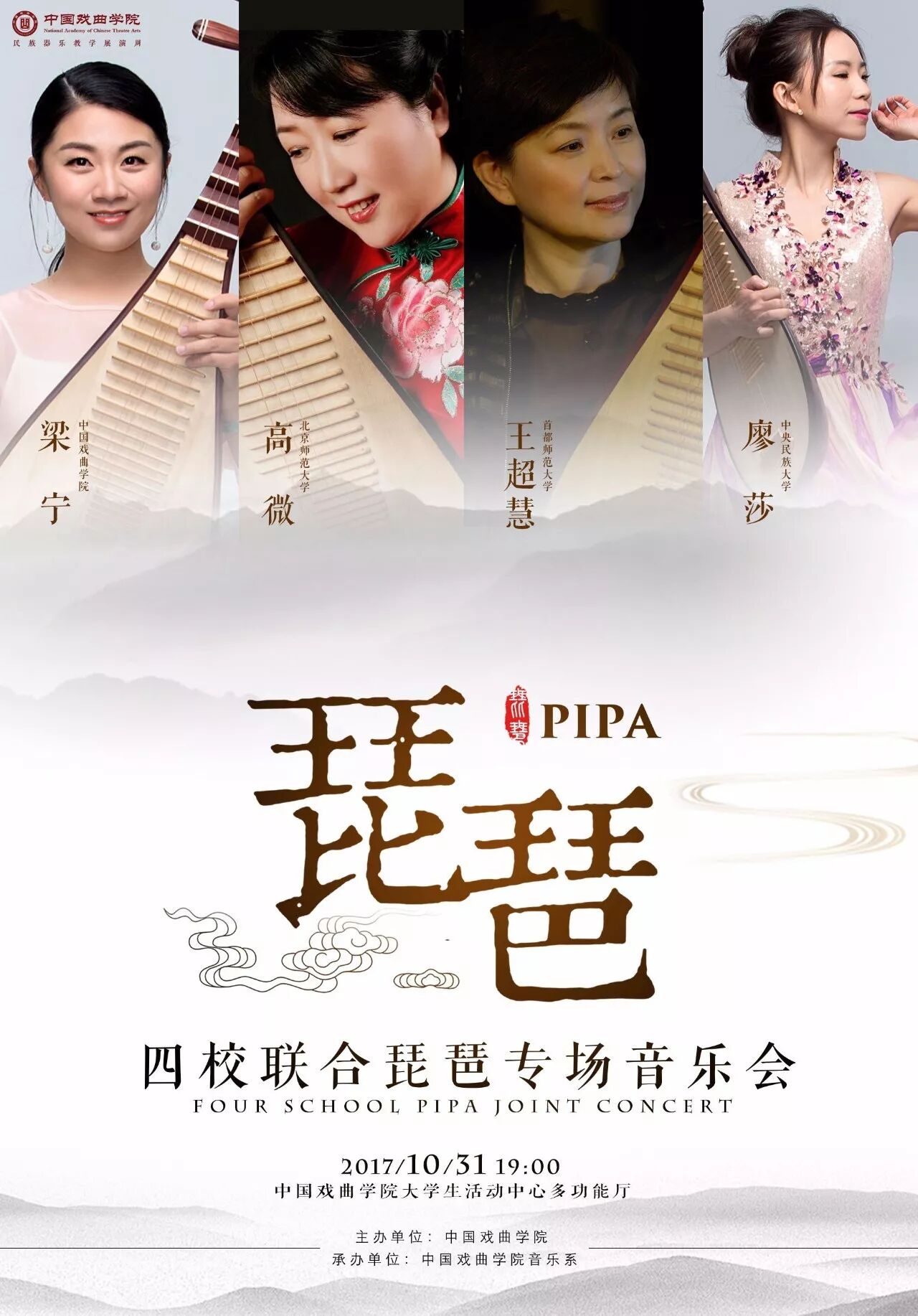 由中国戏曲学院主办的“四校联合琵琶专场音乐会”将于2017年10月31日19:00在中国戏曲学院大学生活动中心多功能厅与您不见不散。这场音乐会由中国戏曲学院音乐系琵琶讲师梁宁担任策划,力邀北京师范大学艺术与传媒学院音乐系器乐教研室主任高微、首都师范大学音乐学院硕导、器乐系主任王超慧教授、中央民族大学音乐学院琵琶硕士研究生导师廖莎加盟,齐心协力共同组织一场琵琶盛宴。