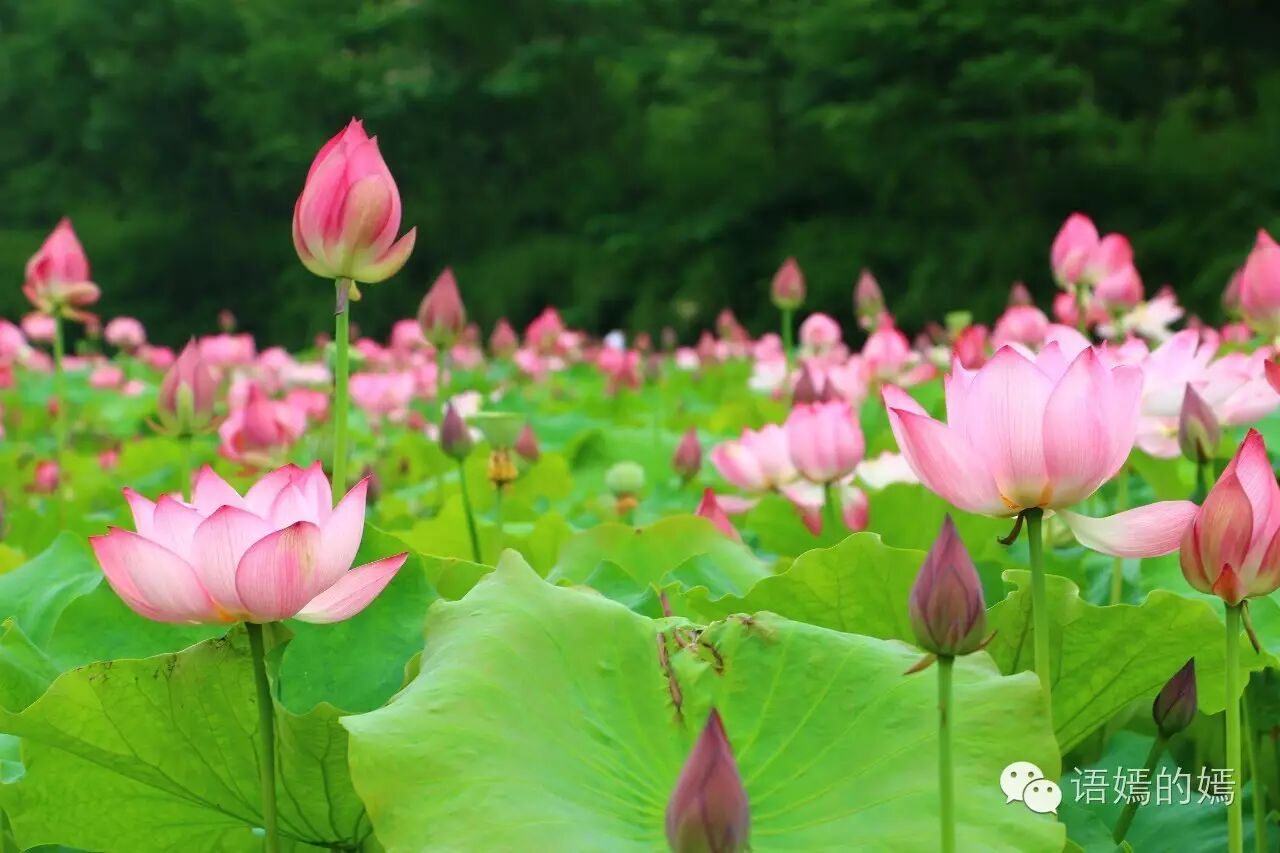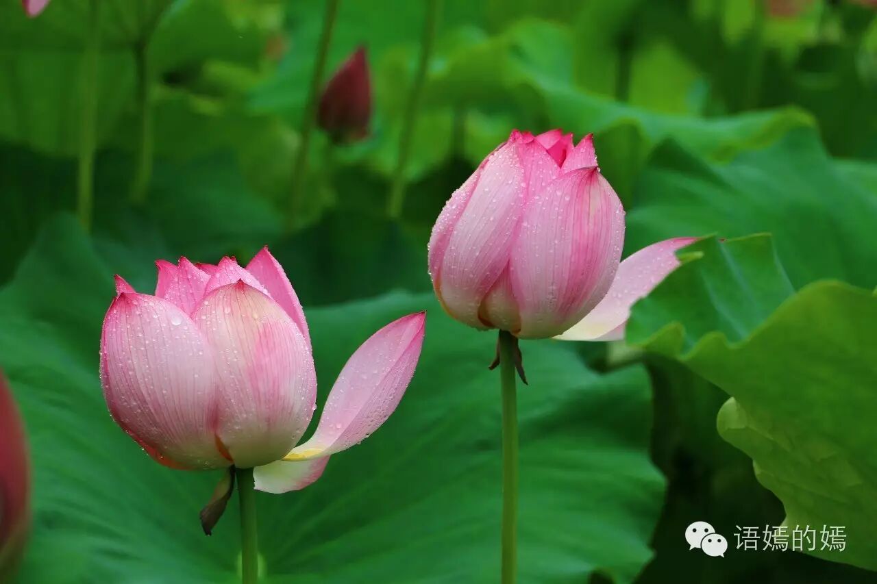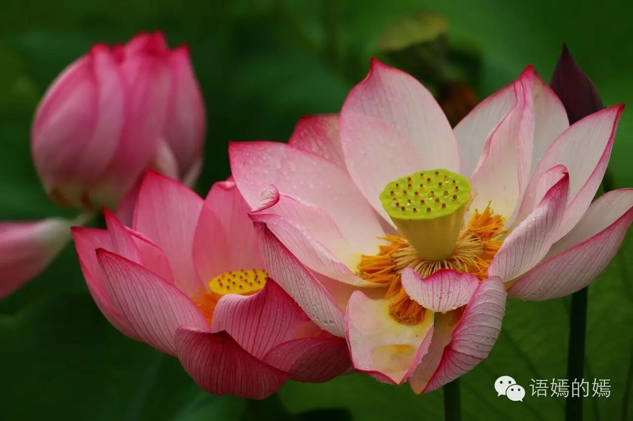 我站在这些荷花中,只觉得眼花缭乱,想去亲吻这一朵,又想去爱抚那一朵。而老天爷对我也格外的眷顾,竟然如我所愿下起了小雨,一时,整个荷塘都笼罩在蒙蒙烟雨中。这时的荷花,又别有一番风韵。像梨花带雨的小姑娘,像刚刚沐浴过的美人。微风一吹,绿浪翻滚,碧波荡漾,无数的珍珠在碧绿的大圆盘上滚来滚去。有花瓣徐徐落在圆盘上,越发衬托出荷叶的苍翠欲滴,而那零零星星飘落在荷叶上的花瓣,一下子就有了禅心,就有了诗意。闭上眼,轻嗅,屡屡清香,入肺,入脑,入心,只觉得全身舒坦。