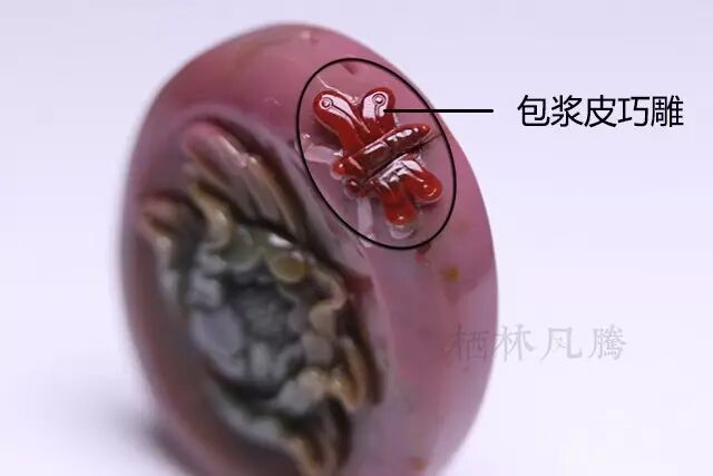 这样一来,既保留了包浆料最原始的风情,同时蝴蝶与牡丹花也构成了更加完美的画面,作品层次感也随之丰富了许多。