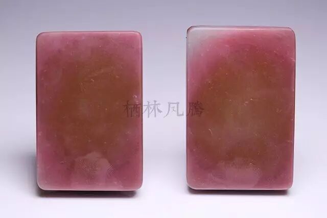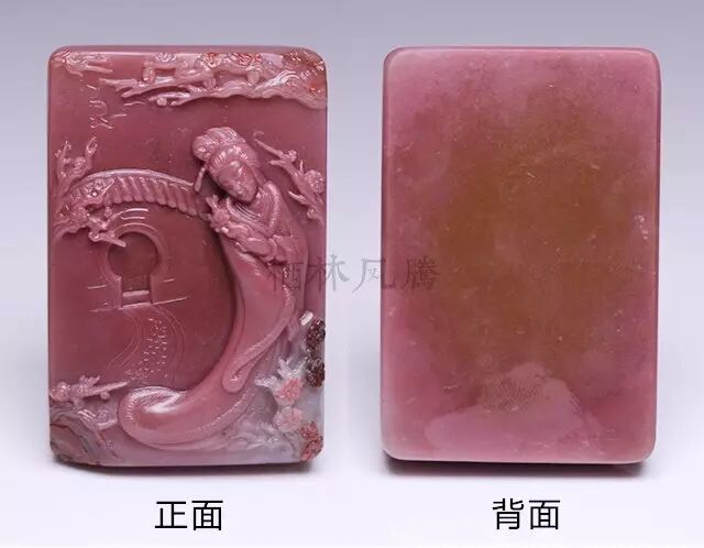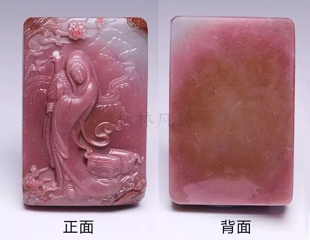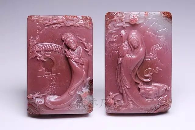 综合考虑到这块糖果料的色泽偏粉色,和雕刻师商量后,切除了很多料子留下了两块大小相似的方牌,做成了以古代美女为题材的牌子。