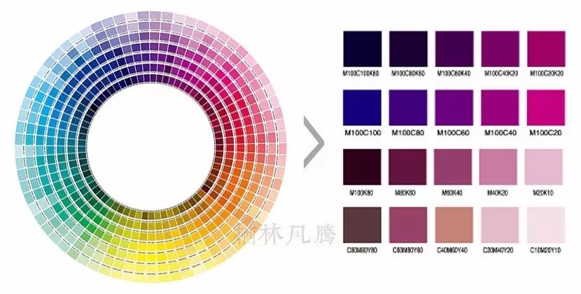 首先以紫色、紫红色、紫粉为主选,依次向褐色、蓝色、绿色、黄色递减。