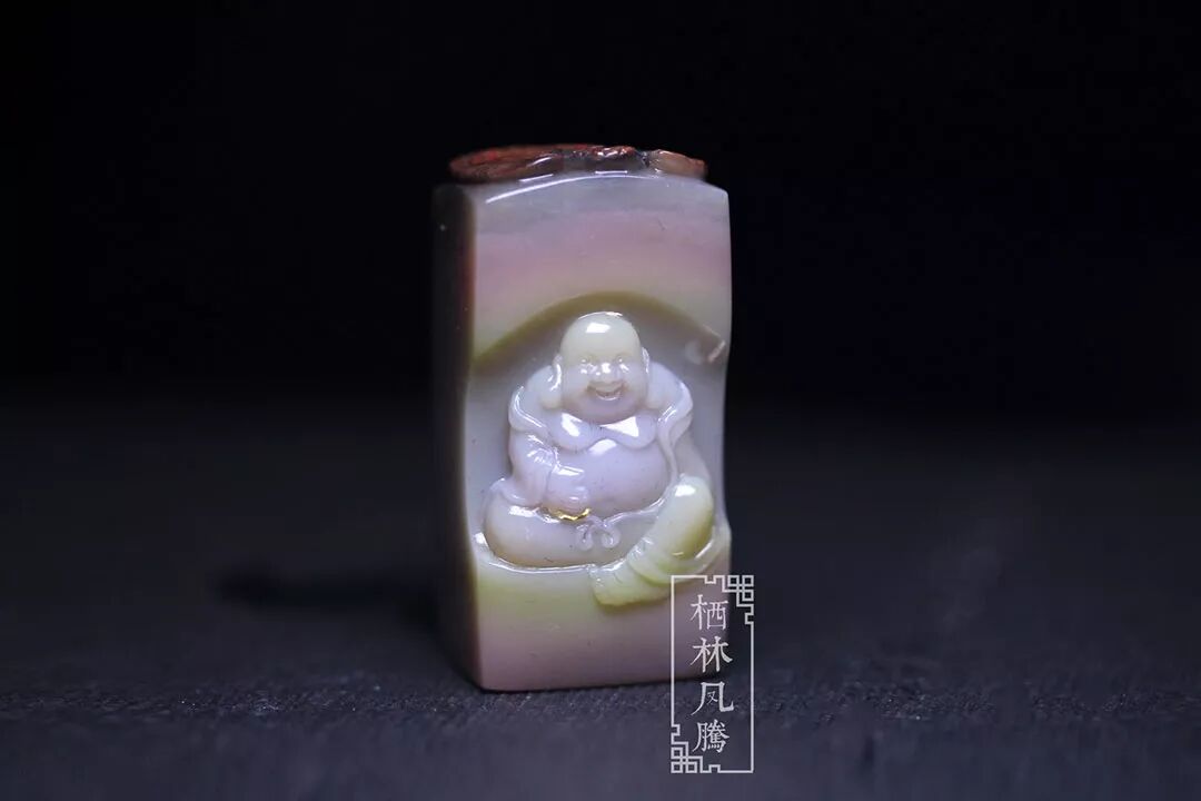 如下面这块料子,雕刻师将中间部分偏白色的翘色巧雕成弥勒佛,顶部包浆处雕刻为展翅的蝙蝠,而背面则将淡紫色部分巧雕成莲花,整个作品形成前后一张一弛的画面感。