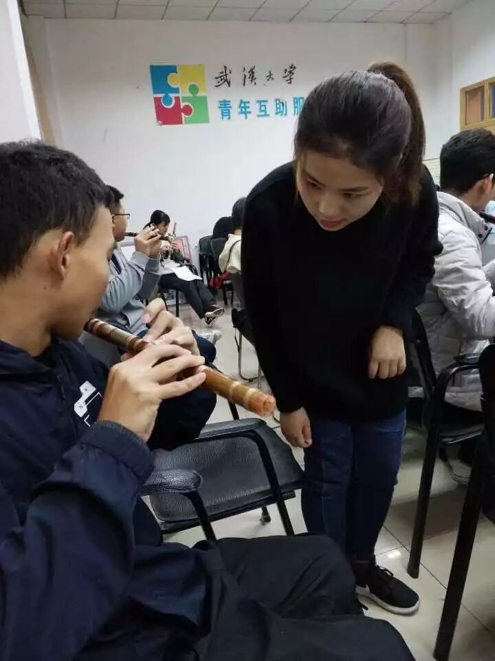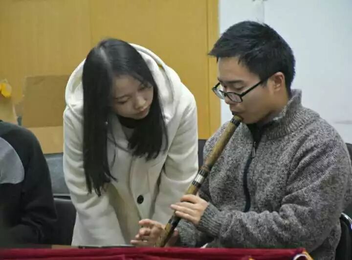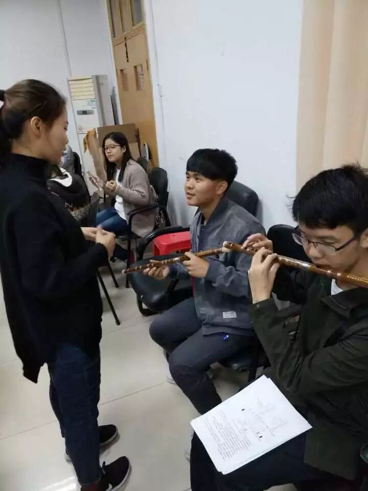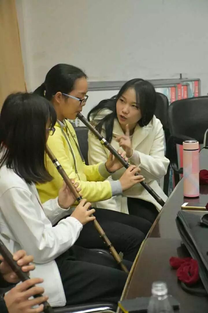 同样的,逄老师就吹响箫,及指法上很有耐心地对大家进行一对一的指导。指出大家的一些问题,像气息不平稳、声音分散不集中、嘴型不正确、吹得有的过重有的太轻等等。最后总结指出大家吹低音5比较困难,可以从吹上面几个长音依次往下练习或从下面往上练习。