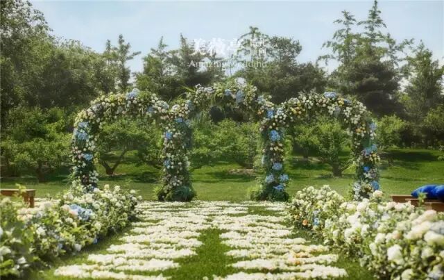 三座花艺拱门打造的仪式区,简单通透却也踏实永固,就像他们的爱情。