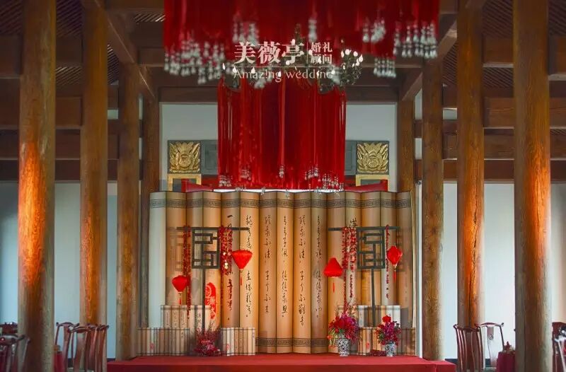 红丝绸带垂挂在中式礼堂中间,还有一扇有故事的屏风。