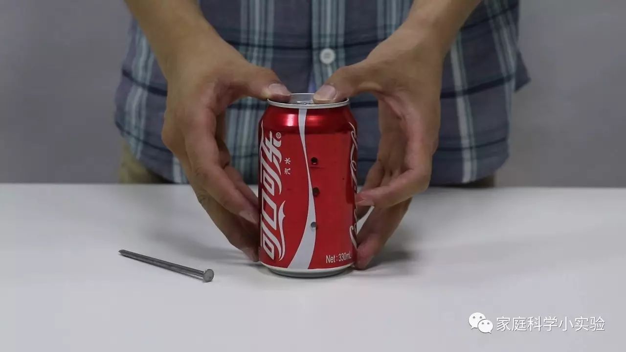 1、在易拉罐口一侧,用钉子扎三个小孔,注意三个小孔要均匀竖直排列。
