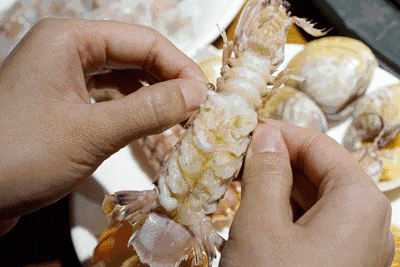 母琵琶虾翻过来后“脖子”上有三道明显的白线,虾尾部壳里有黄。母的香,公的鲜,可根据自己的口味选择。