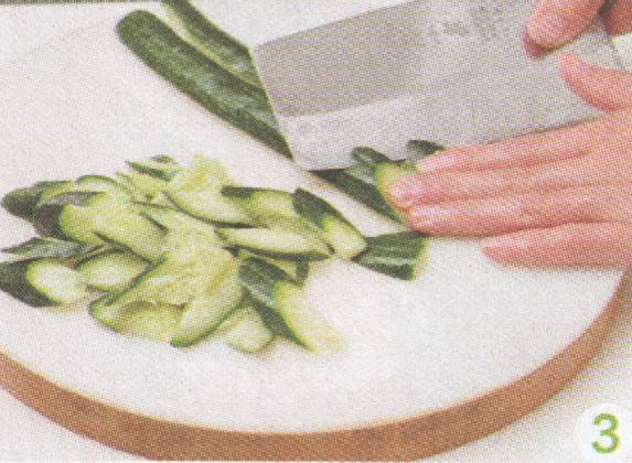 3.黄瓜洗净,用刀拍开,斜切成块,备用。