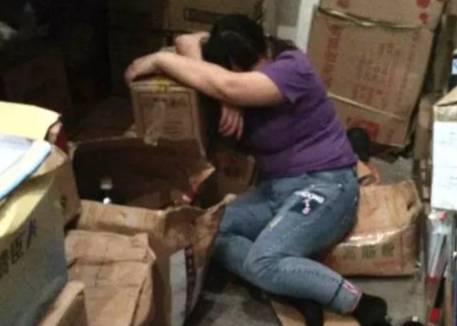 她累得趴在箱子上睡着了……