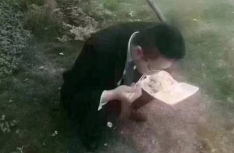 草地上,一个销售员被客户爽约,无奈地哽咽着,吃着手里的盒饭。