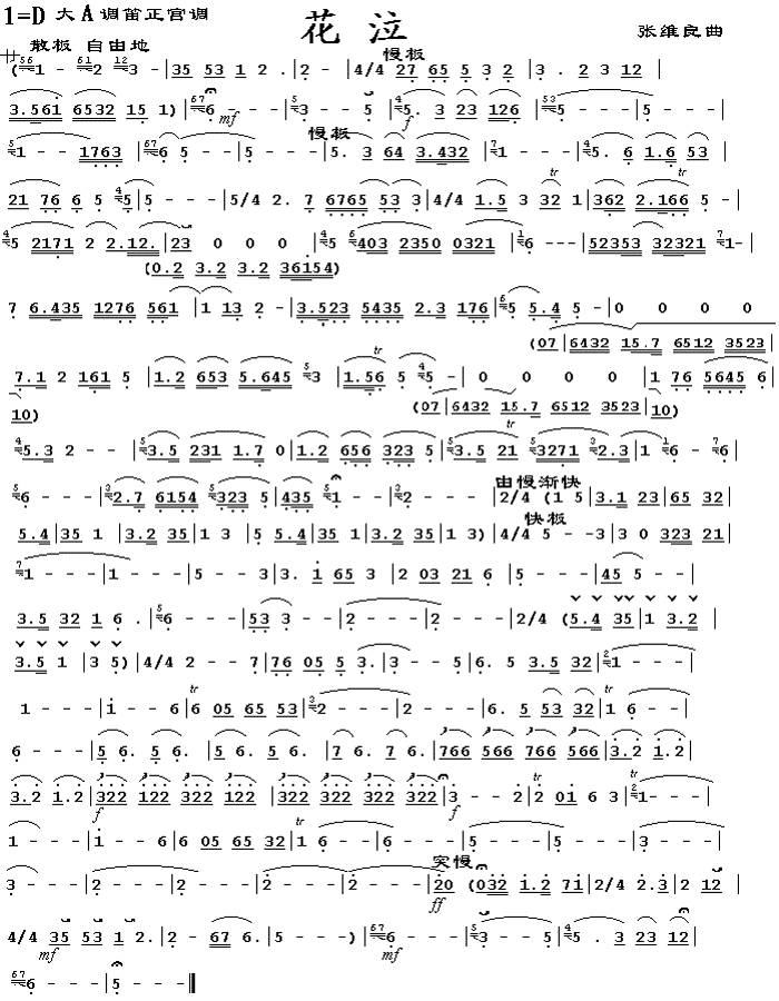 笛子曲《花泣》是由演奏家张维良先生以苏州评弹“丽调”和“黛玉葬花”为基本素材而创作的,演奏上以散板、运腔与紧打慢唱的技法相结合,使音乐具有强烈的感染力和表现力。