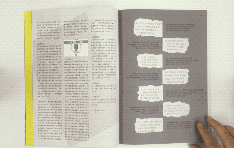 我们也稍微讨论到做杂志这件事情,我们希望在做一本实体杂志的时候可以与被微信或互联网消解的文字完全区分开来,因为它毕竟是一本需要你实际用手拿着,需要你翻阅,需要放在膝盖上花时间去翻的东西。所以我们在杂志中用了一些透明页,透明页本身会提供一些特别的质感,一点是透明页上印的东西会与后一页重合,另一点是前一页透明页稍微离开后一页的时候,透明页上的内容会消失,从那样的视角会看不见,所以这也是呼应了我们杂志的大主题。我们是从一个现象出发,所谓“久视不识”就是人视觉饱和的现象,你盯着一个字看很久就会不认识这个字,我们通过一个小的处理让大家更关注观看过程。