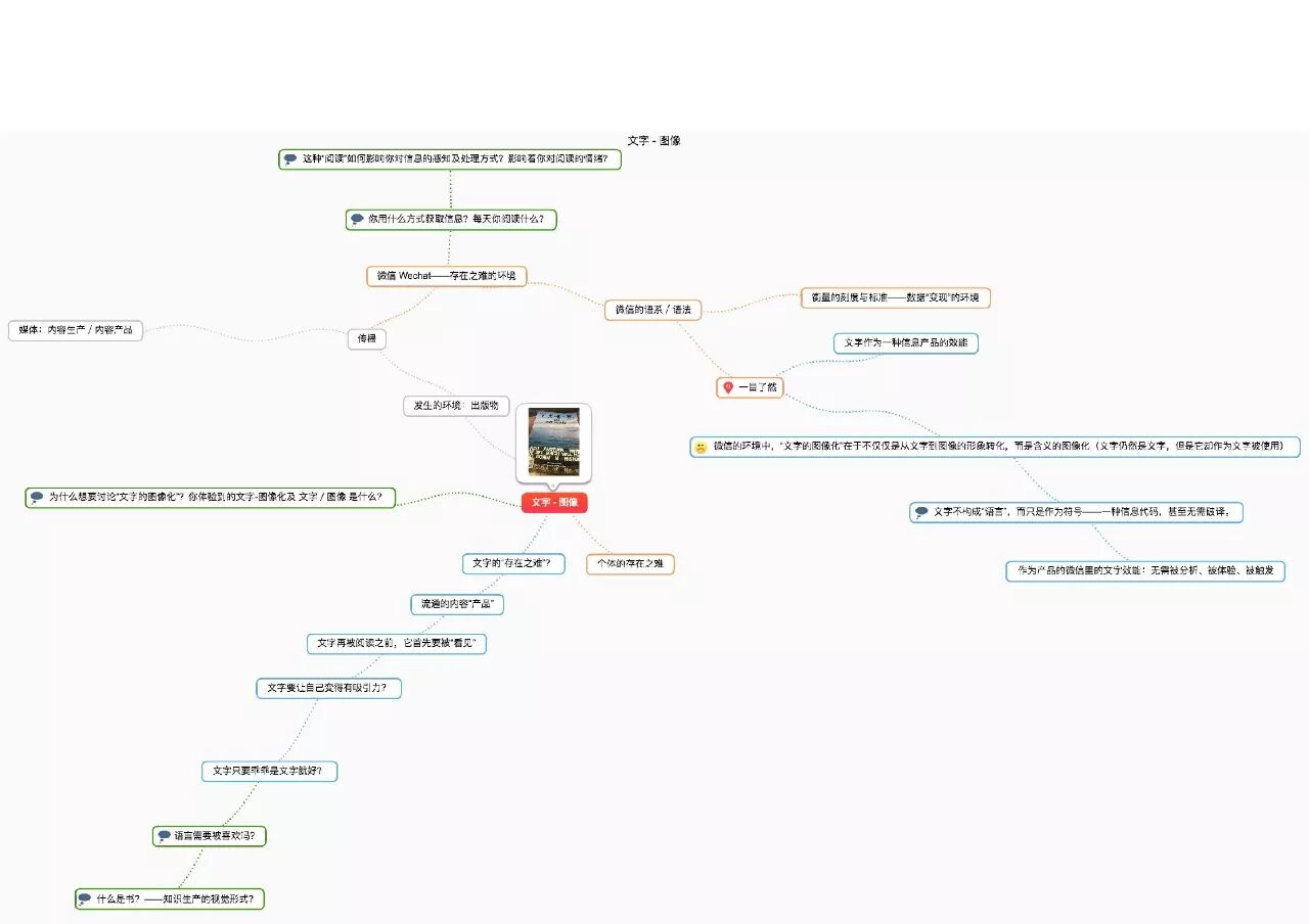 汪汝徽:《久视不识》是一本杂志,一个在传播领域流通的出版物。当顾灵告诉我“久视不识”这个话题时,我认为这会触动任何一个对文字敏感的人。由于之前我个人的工作经历是一个媒体领域的文字工作者,这个“文字/图像”的课题首先让我联想到的即是微信这个介质上的信息生产方式。我今天的分享和提问,采用的方式是一张思维导图。而微信这个介质上发生的“文字图像化”正与思维导图很像,但比思维导图更扁平。它们的共同点在于:所有的信息都要“一目了然”,在划动手指的过程中所有信息都要在一瞬间让人获知。