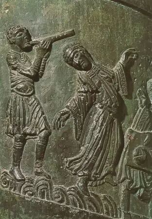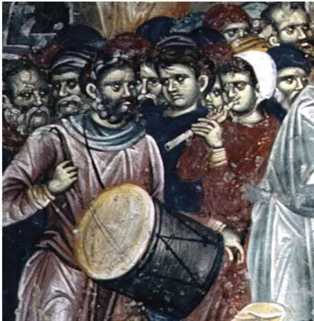 实际上更古老的有关「竖着吹奏的管状乐器」的记录也并不鲜见,比如这幅发现于德国的十一世纪的教堂壁画,画中人物吹奏的乐器八成也是竖笛。