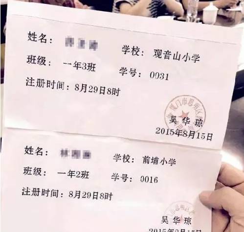 (图为骗子伪造的入学通知书,上面有孩子的姓名、班级、学号、注册时间等,还盖了“厦门市思明区教育局招生专用章”)