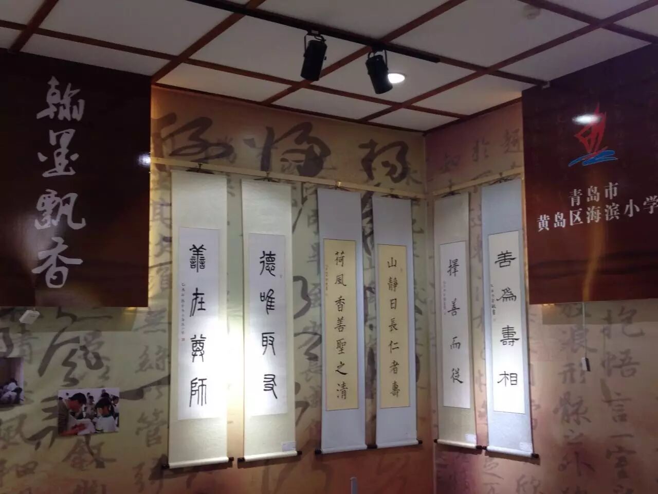黄岛区海滨小学展出的“善”字楹联书法作品,以“沐善润德”德育品牌为主题,透露着浓浓的墨香和古韵。