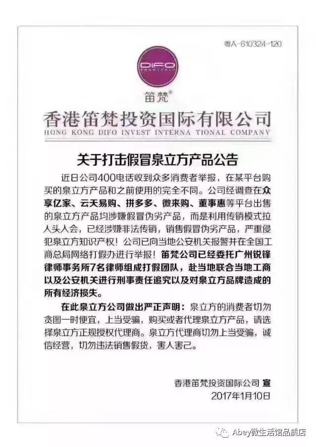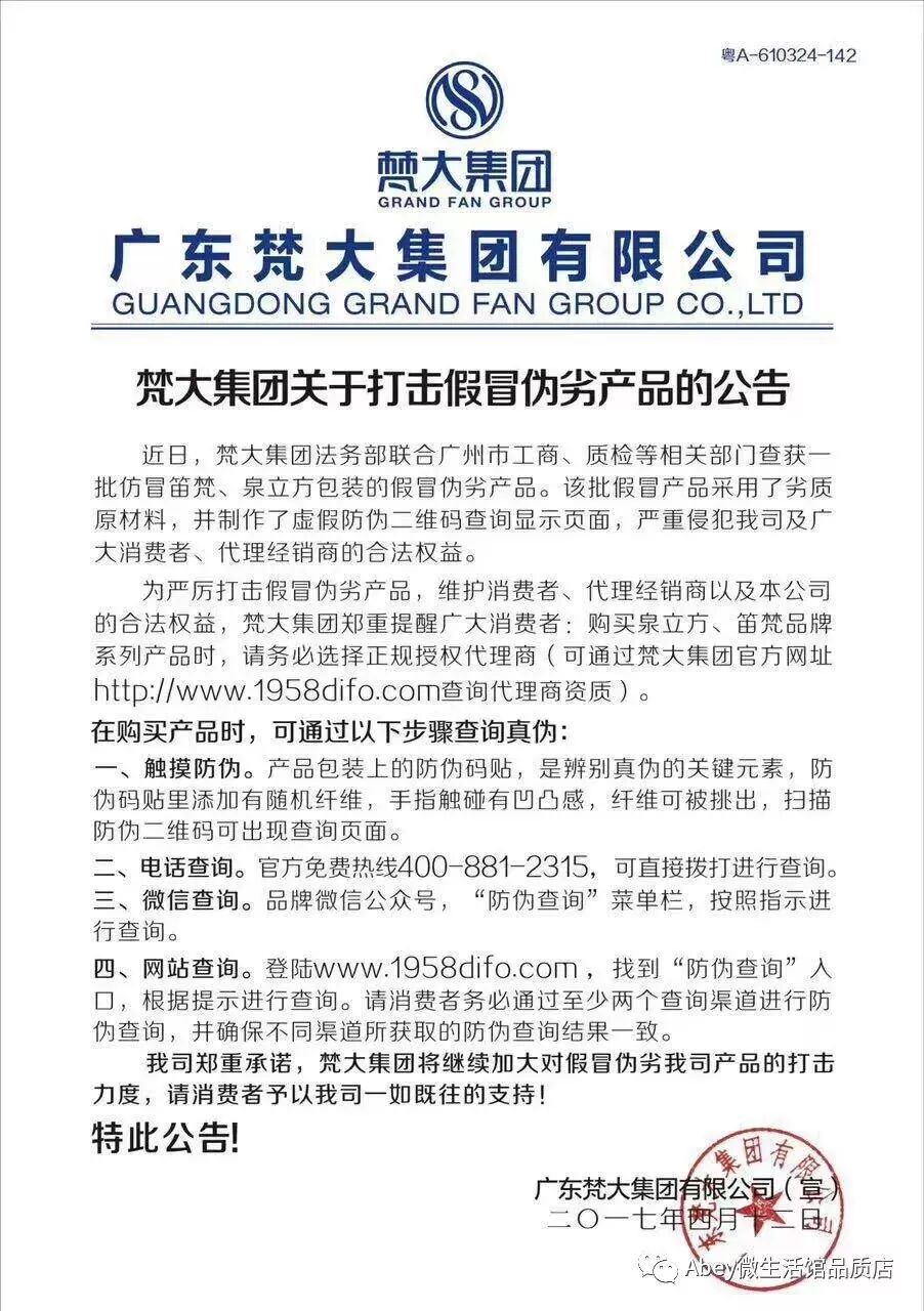 梵大集团向各位产品使用者发出公告
