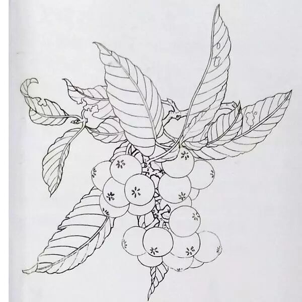 步骤一:勾线。(认真观察琵琶的具体形态及特征,画出琵琶的铅笔稿。然后用淡墨勾出枇杷果实的轮廓,用中墨勾出琵琶叶子,用重墨勾住枇杷的枝干。)