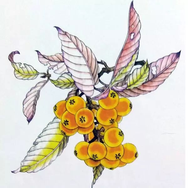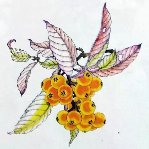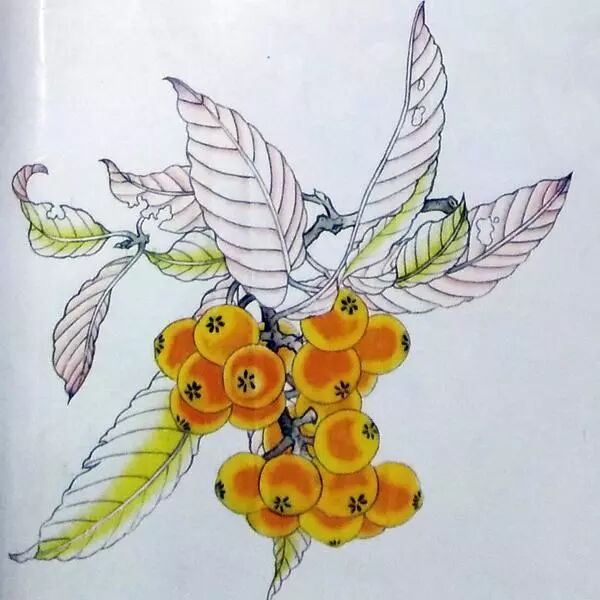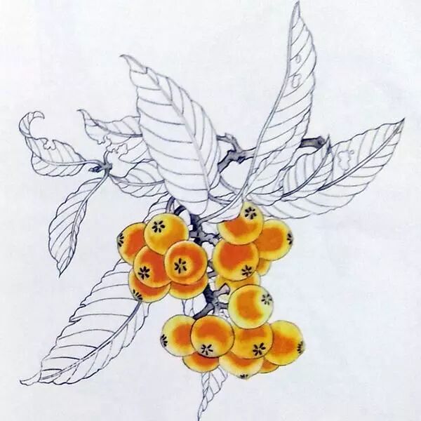 步骤二,墨线勾完后,先用朱磦分染枇杷的果实,然后用藤黄统染整串枇杷,并且用中墨和水画出琵琶枝干上的纹理。