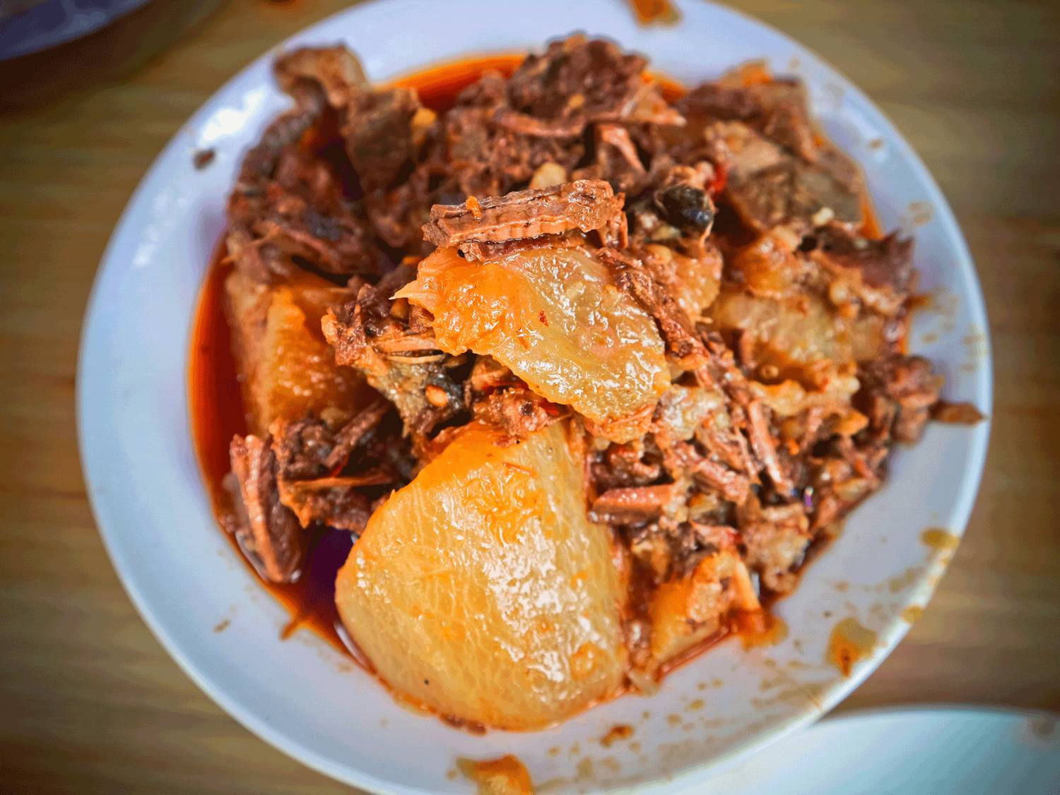 两菜一汤,店主为我们两个人端上的标配,萝卜烧牛肉、粉蒸牛肉、番茄牛肉汤,家常的味道就像以前院坝头吃大锅饭,分量足、味道略重、肉质鲜香麻辣,身为成都资格的牛肉餐馆,它在成都老餮们心中占据重要的江湖地位。