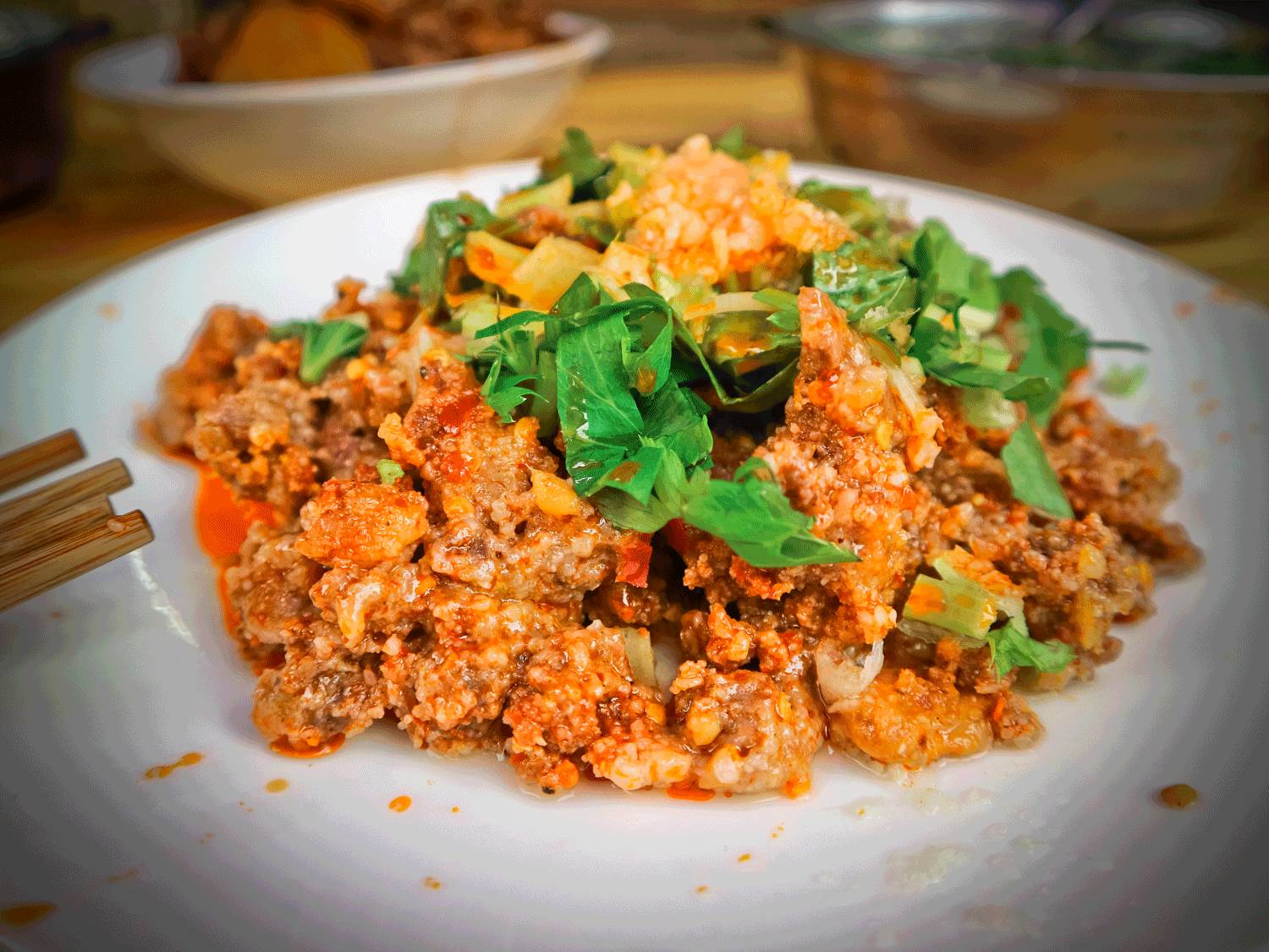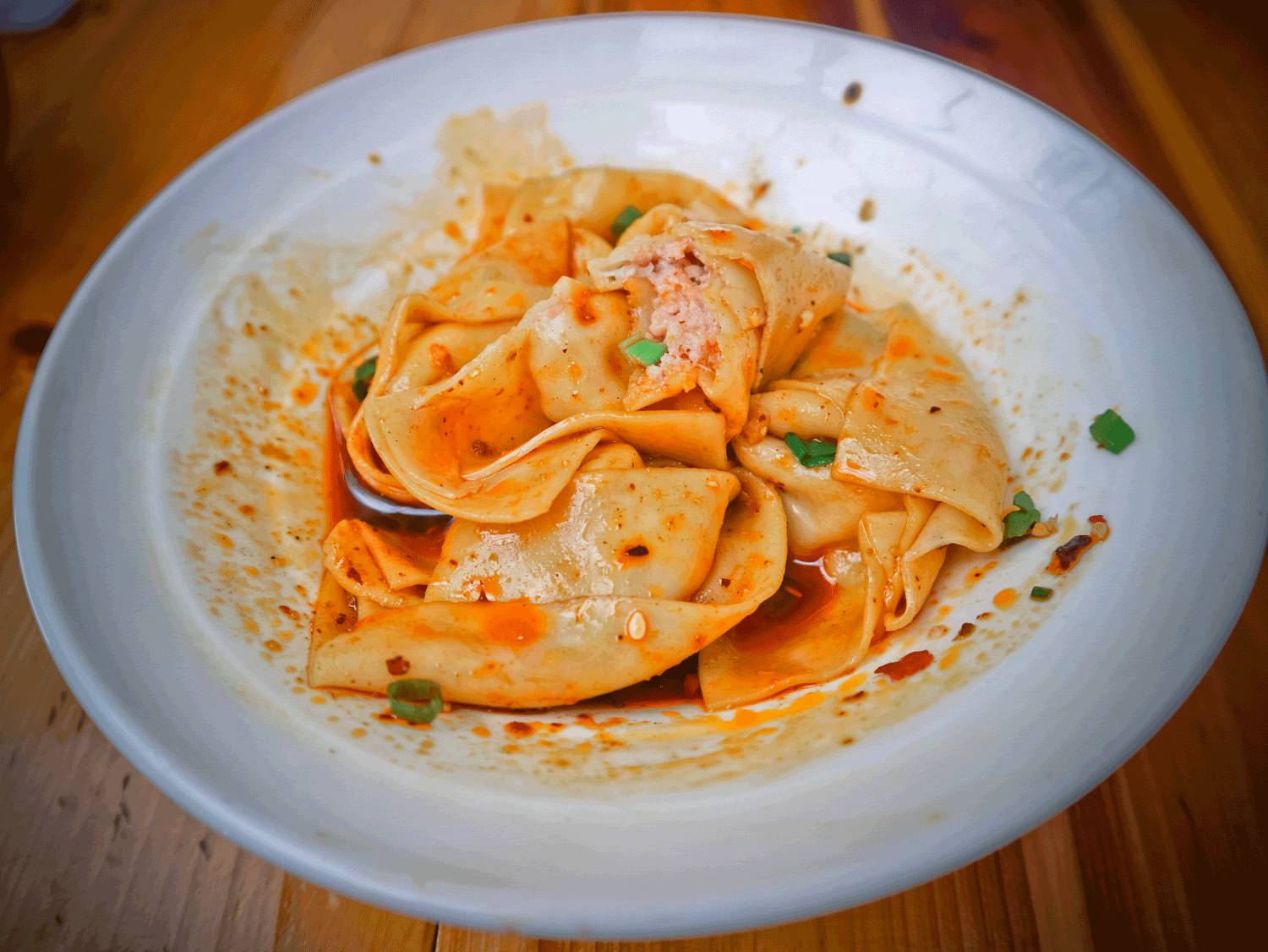 会长点了一份家传干拌抄手,7元一两五朵大抄手,抄手皮清莹薄亮略像北方的馄饨皮儿,手擀皮的清香软嫩融入细碎饱满的肉馅,第一次在成都吃到馅中葱姜皆备的抄手。而白芝麻、白糖、粗细辣椒面、花椒面按比例配制的红油浇头,为整份抄手提亮不少,用料大方就像坐在家里吃着妈妈做的那一碗。