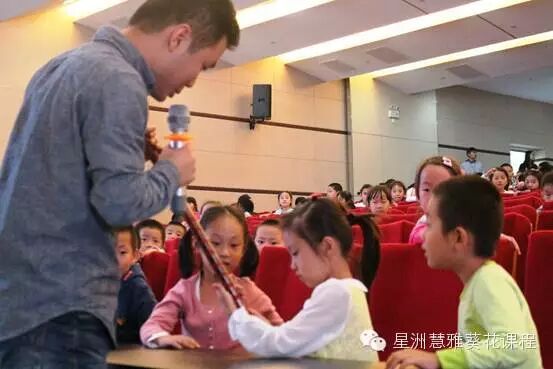 然后,陈柏良老师演奏了不同音色的竹笛,笛音回旋,孩子们惊叹不已,不时响起一阵掌声。
