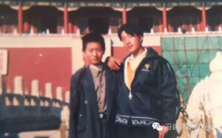 海心2000年北京砖厂打工时在天安门与伙伴拍摄的照片。