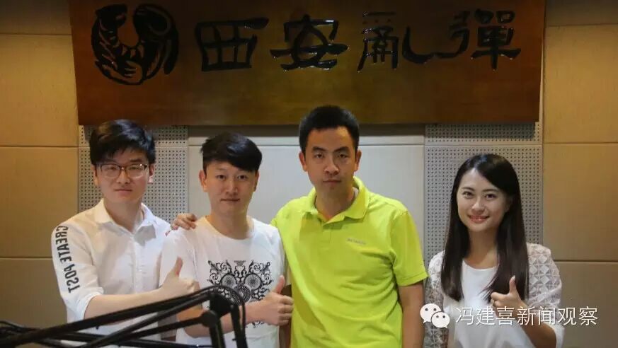 歌手海心作客陕西秦腔广播西安乱弹直播间,接受访问前与刘昕(右二)、瑞瑞(右一)、亮亮等主持人合影留念。冯建喜摄