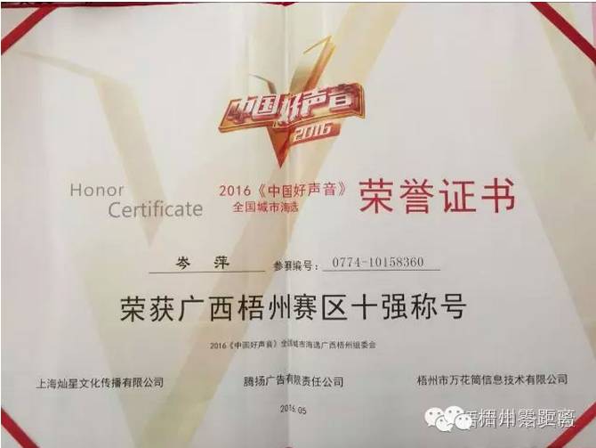 近日,梧州申浩学校又传喜讯,该校音乐老师岑萍在2016《中国好声音》全国城市海选活动中,喜获“广西梧州赛区十强称号”。据悉,岑老师在比赛中排名十强第四名。此前,她还多次获得市级、自治区级、全国级的各类声乐比赛奖项。![]()