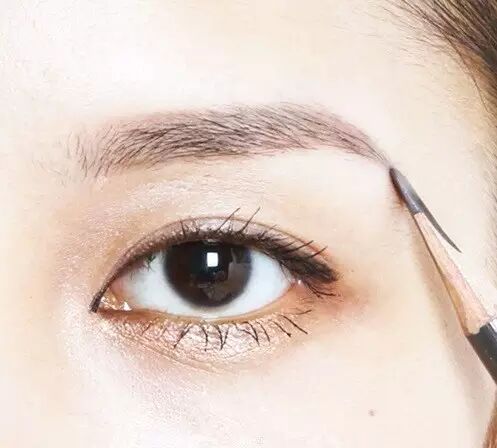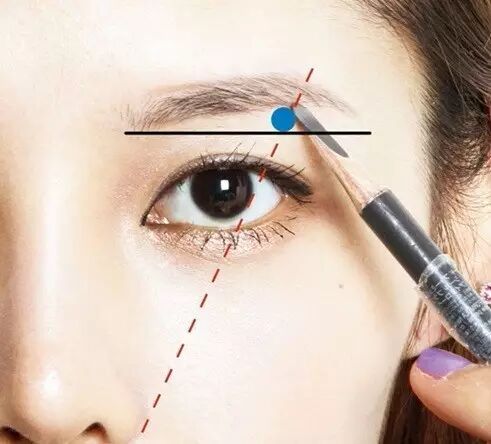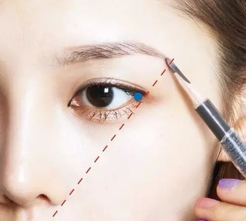 Point 2:眉尾画多长才算漂亮?用你的眉笔比划一下就知道了,嘴边、鼻翼、眼角的延长线,交汇到眉毛的位置就是眉尾的长度。