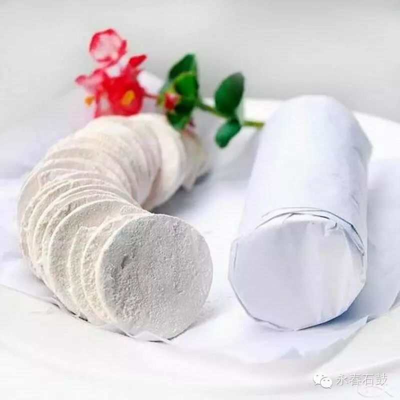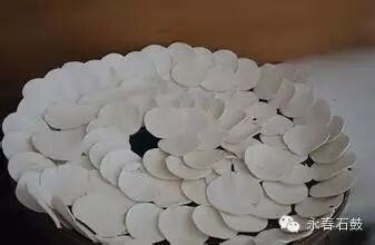 制作方法:嘴里叼一根琵琶弦,另一头扯在手里:待拿捏好的米浆团登场,快速扯动琵琶弦将米浆团割成大小均匀的薄片……手起线落处,一片片白色的圆形米浆薄片飞落竹匾,很有点武林高手的意味。