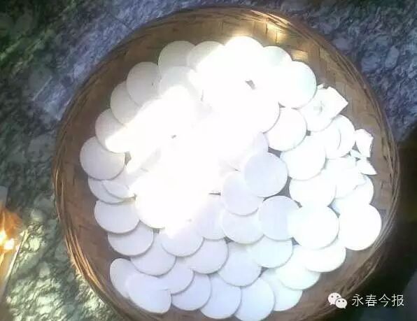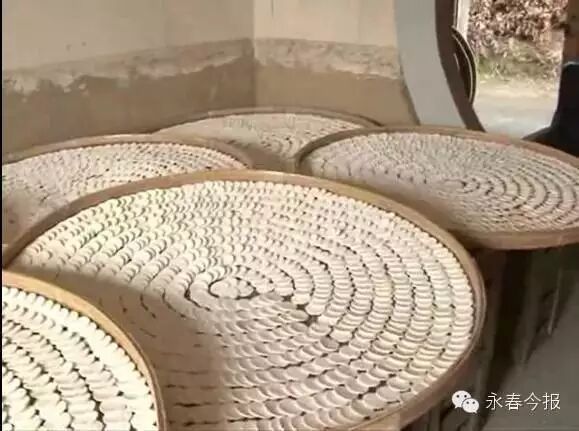 嘴里叼一根琵琶弦,另一头扯在手里:待拿捏好的米浆团登场,快速扯动琵琶弦将米浆团割成大小均匀的薄片……手起线落处,一片片白色的圆形米浆薄片飞落竹匾,很有点武林高手的意味。