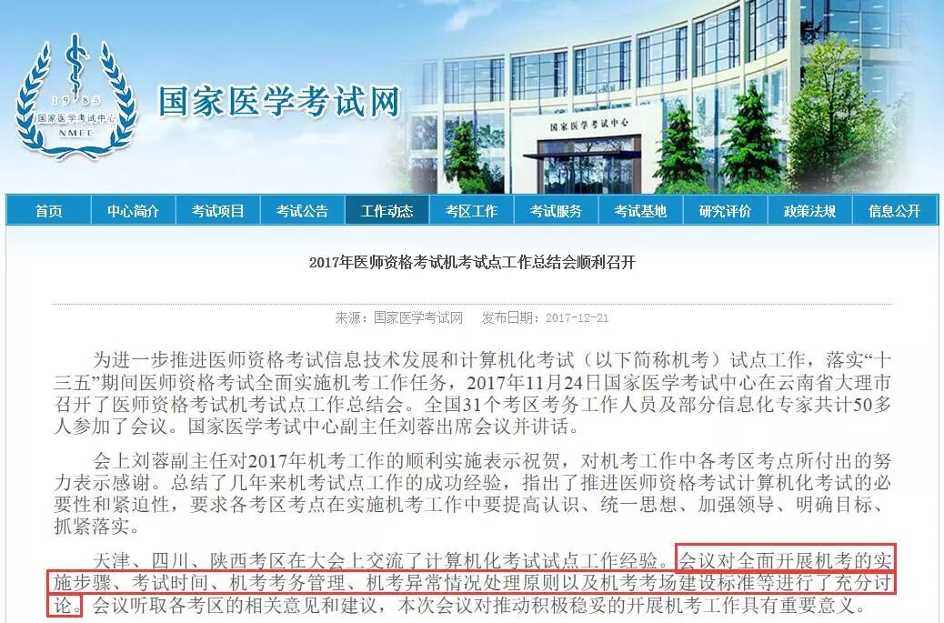 近日,国家医学考试中心在云南省大理市召开了医师资格考试机考试点工作总结会上,对近年来医师资格机考试点成效进行了讨论,总结了几年来机考试点工作的成功经验,指出了推进医师资格考试计算机化考试的必要性和紧迫性。