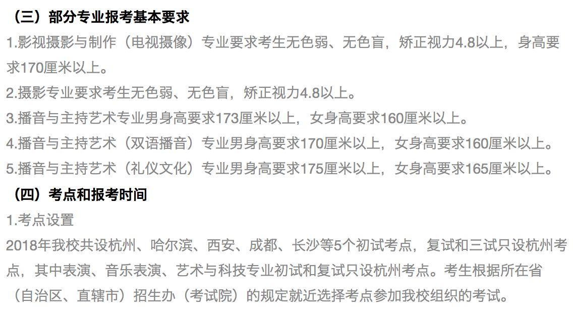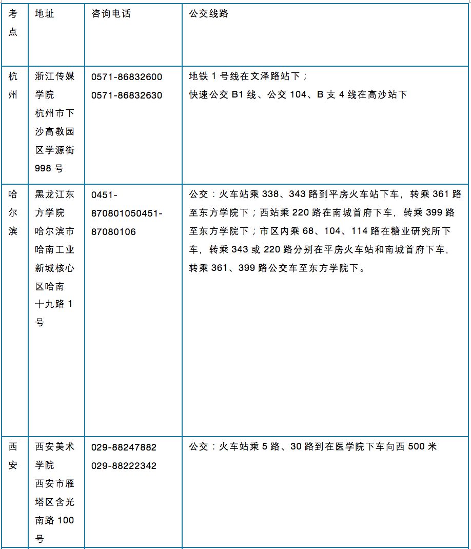 1.以上广电艺术类本科专业及专业方向面向全国招生,设杭州、哈尔滨、西安、成都和长沙5个初试考点,复试和三试只设杭州考点,考生可按当地招生办(考试院)规定选择考点参加我校组织的考试。