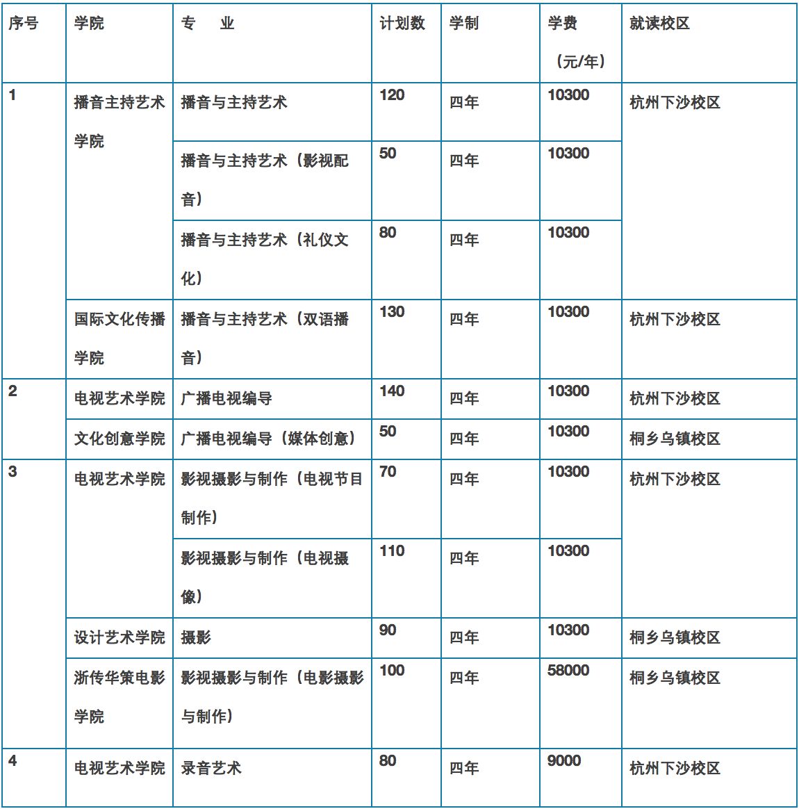 9.浙江传媒学院播音与主持艺术、播音与主持艺术(影视配音)、播音与主持艺术(礼仪文化)、播音与主持艺术(双语播音)、广播电视编导、广播电视编导(媒体创意)、影视摄影与制作(电视节目制作)、影视摄影与制作(电影摄影与制作)、影视摄影与制作(电视摄像)、摄影、,实行全国计划,并由学校自主划定艺术类文化分数线。