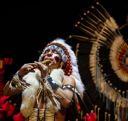 一位脸上涂着油彩,戴着鹰羽冠头饰,手臂上缠着象征图腾的绑带,有着浓浓的原始部落味道,跪在地上手中持着古老而神秘的乐器在演奏的一位印第安演奏家。