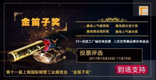 “优品全球:以品质为耀,做世界一流;以创新为耀,赢在拐点。”这是2017上海钢管展的主旨,从“中国制造”到“中国质造”,需要领先企业的模范带头作用。作为此次展会的重要组成部分,“金笛子奖”人气展商网络票选活动目前正式启动,本活动组委会将根据参展商的参展产品、展位人气、展位关注度、企业影响力等作为综合参考因素,由观众来票选出优胜者。组委会将于展览会同期活动-钢管产业链发展与应用大会(DASTIC2017)现场为各类别得票最多的展商颁发“金笛子奖”荣誉奖品。