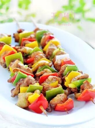 5.用竹签将鸡块、青红椒块,随你喜欢的排列顺序串在一起